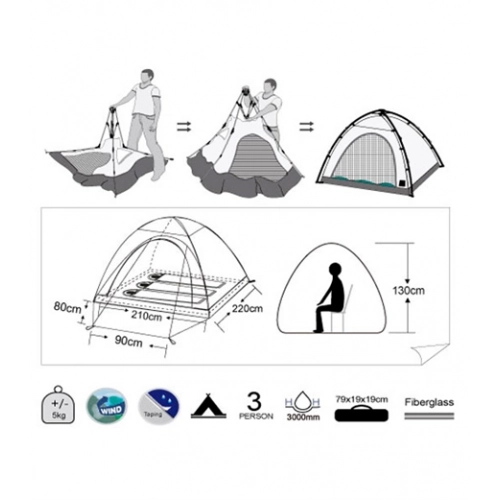 Campingtelt med plass til tre personer."Flash-touch" systemet gjør at teltet settes opp på ca 30sekunder. Ved at yttertelt, innertelt og stenger sitter festet sammen gjør det at oppsett og nedpakking går meget raskt.