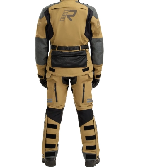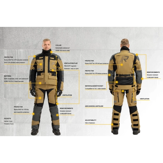 Rukka Adventure motorsykkeljakke for menn. Myk neopren i kragen. Ermeavslutninger med glidelåser og vanntette GORE-TEX innermansjetter. Stretchpaneler på brystet, under armene og på ryggen. Stropper på skuldrene og elastiske løkker bak på jakken for montering av vannblære. Avtakbar vanntett stormkrage i GORE-TEX Stretch-materiale. På brystet, FIDLOCK® magnetiske fester som er enkle å åpne med én hånd. Breddejustering på overarmen med trykknapper. Justerbar kant og ermeavslutninger med borrelåsstramming. Justerbart midjebelte. Skrittstropp og lang glidelås for bukser. 100 % pustende, vind- og vanntett GORE-TEX Pro 3-lags laminert til slitesterk CORDURA® skallstoff. Slitasjebestandige CORDURA® 1500D forsterkninger på skuldre og albuer. Stor lomme nederst på ryggen, kompatibel med en 1,5 L vannblære. Vannavstøtende dokumentlomme inni. To vannavstøtende nedre lommer med glidelåser og borrelås.