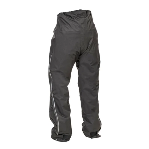 Slitesterke og elastiske regnbukser, designet for å brukes over motorsykkelbukser. Justerbar midje og ben. Kan åpnes i sidene. VANNTETT STRETCH PE Dryway+ Elastisk polyesterstoff Teipede sømmer Nettingfôr Reflekterende trykk Laget for å passe over alle motorsykkelbukser
